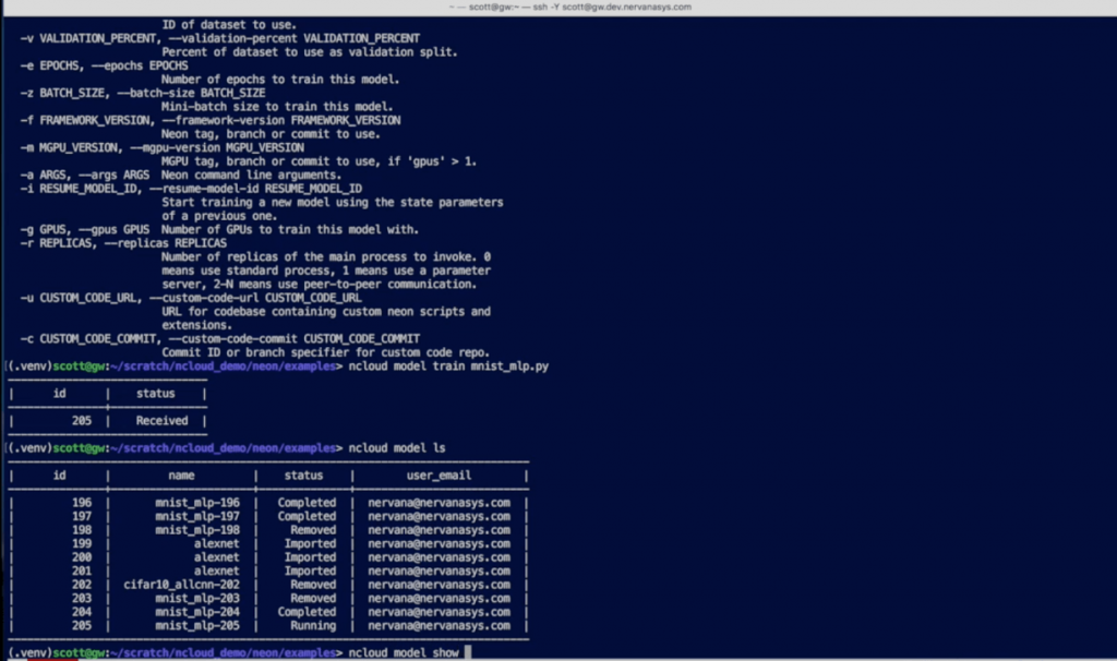 This is a demo of the private beta version of the Intel® Nervana™ and a command line utility (ncloud) used to submit training jobs, list active jobs, show status of jobs and resources, deploy models, download parameters, and upload datasets.